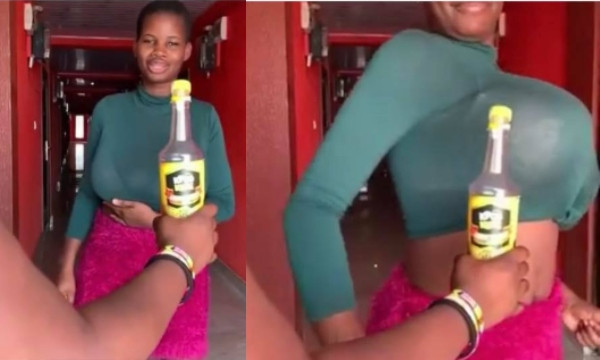 While a friend held a bottle of popular alcoholic beverage Kpookeke in the video, the Ghanaian-Kenyan socialite and model ran through in slow motion effect and ended up removing the bottle cap with her boobs.