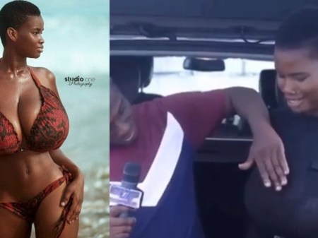 Big boobs model, Pamela Odame allows interviewer to touch her boobs, says she can last for 10 rounds and 2 hours during sex (video)