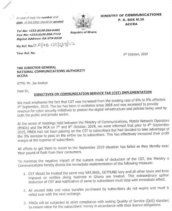 The letter signed by the minister in charge of the sector, Ursula Owusu-Ekuful also said telcos in Ghana should stop the instant deduction of the Communications Service Tax (CST).