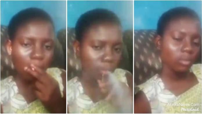 The yet-to-be-identified young lady was ‘thrilling’ herself with a rap song which talks of boycotting school to go hustle whiles she puff cylinders of smoke.