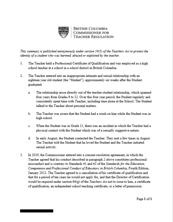 The decision from the B.C. Commissioner for Teacher Regulation does not reveal the name of the teacher, his age or even the district where he worked. The province’s Teachers Act allows the commissioner to withhold identifying information if doing so can help protect victims of abuse or exploitation from further hardship.