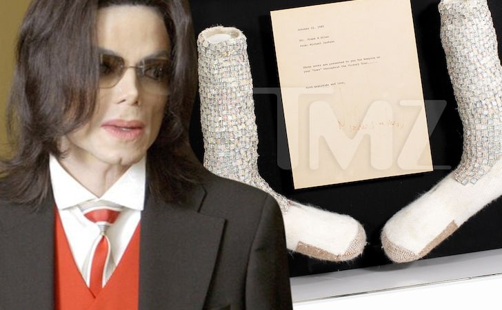 The socks are part of Frank DiLeo collection. DiLeo is the late music exec who signed Micheal Jackson to Epic Records and managed him from 1984 to 1989 following the massive success of “Thriller.”