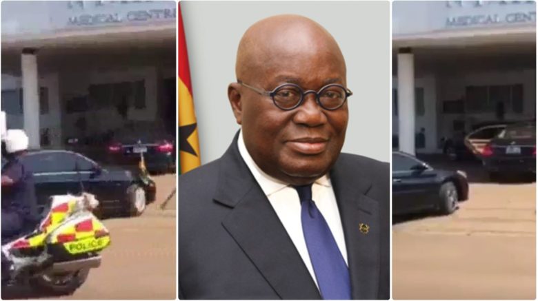 In a fast trending video, three vehicles believed to be presidential cars with one decorated with the Ghana flag and the country’s coat of arm could be seen heading towards the Airport Residential Area-based hospital.