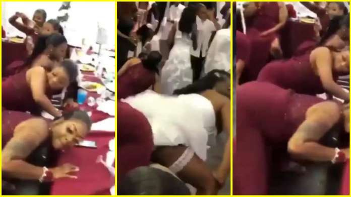 Each of the burgundy wearing maids could be seen busily twerking while the bride who stood in their midst was also wildly twerking.