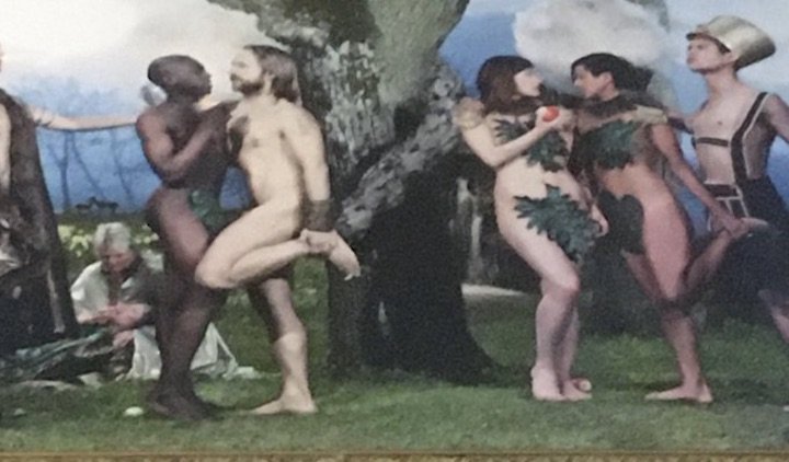 Wallin’s photo illustration includes two men nearly nude leaning against one another, as well as two women, one with her arm wrapped around the other and the lovers locked in a gaze. The two same-sex couples are the most prominent queer-affirming imagery in the painting.