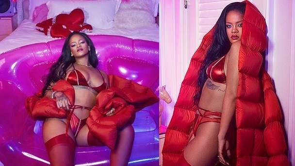 The 31-year-old Umbrella hitmaker flaunted plenty of flesh as she was pictured posing in red lingerie, matching heels, socks, and oversized long puffer coat.